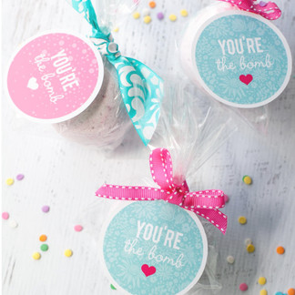 This is a fun one that I’ve done variations on for Valentine’s Day, Teacher Appreciation, etc. Depending on how much you want to spend, you can find individual or bags of bath bombs at Lush, Harmons, Target, or Walmart. If you’re going the lip balm route, you can find EOS lip balm to fit on those printables just about anywhere.